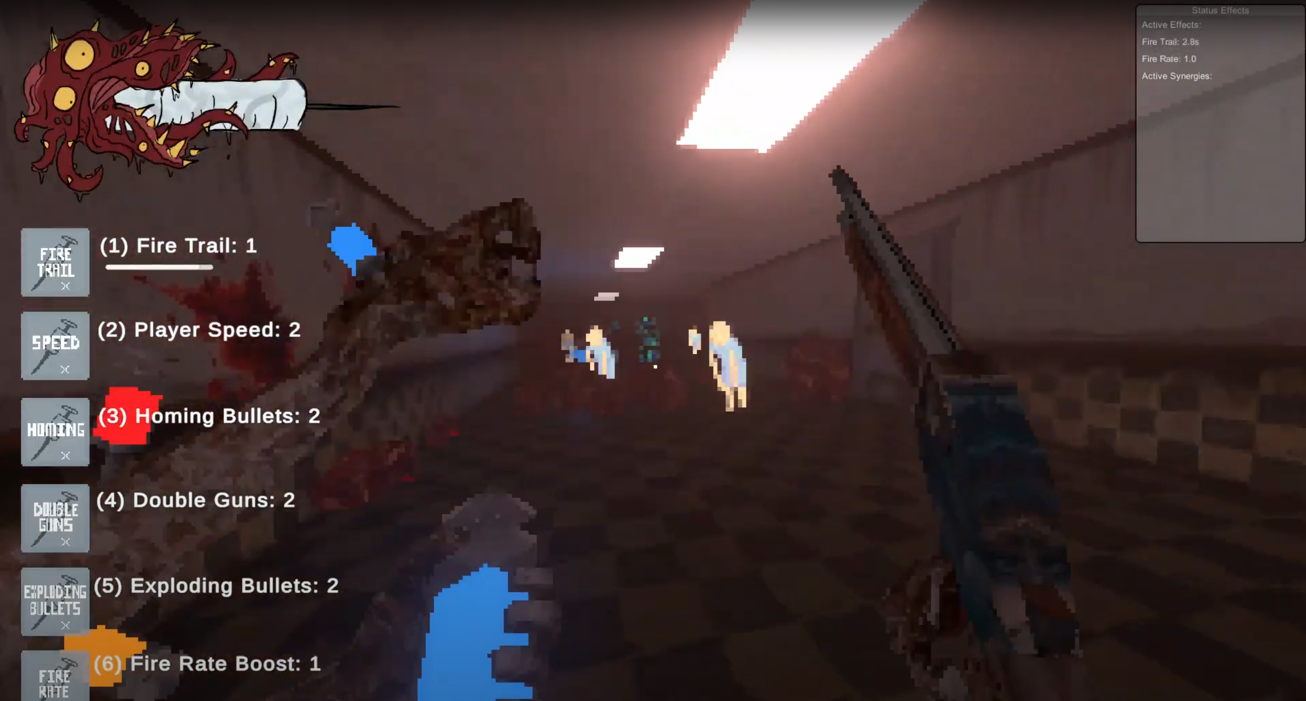 Shoot your way through droves of enemies while you mix and match buffs to maximize your enemy shredding potential. Keep killing to pick up more buffs and to keep your adrenaline up so you can reach the exit... or die trying.